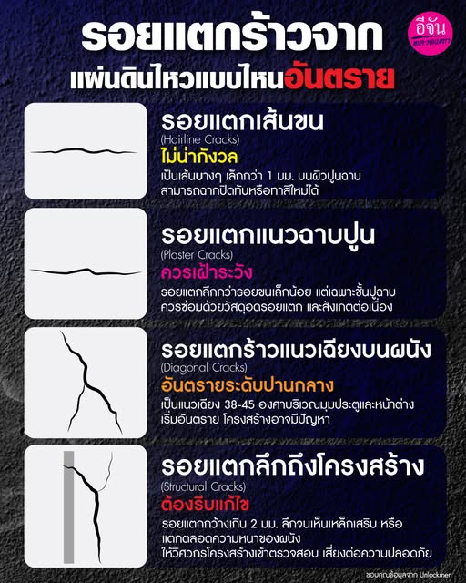 หลังแผ่นดินไหว ควรตรวจเช็คโครงสร้างของบ้านที่อยู่อาศัยว่ามีรอยแตกร้าวที่ผิดปกติหรือไม่ ดังนี้ 1. รอยแตกเส้นขน (Hairline Cracks) – ไม่น่ากังวล ลักษณะ: เป็นเส้นบาง ๆ เล็กกว่า 1 มม. บนผิวปูนฉาบ สาเหตุ: ก